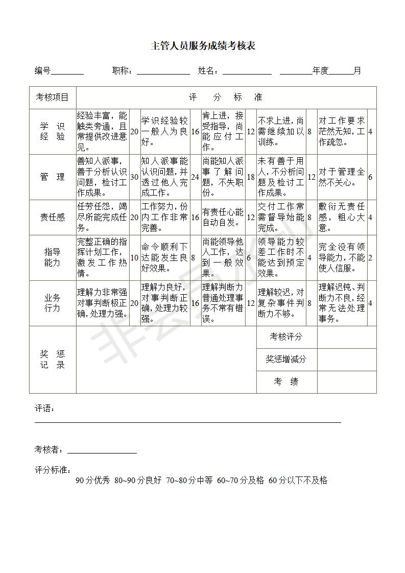 主管人员服务成绩考核表